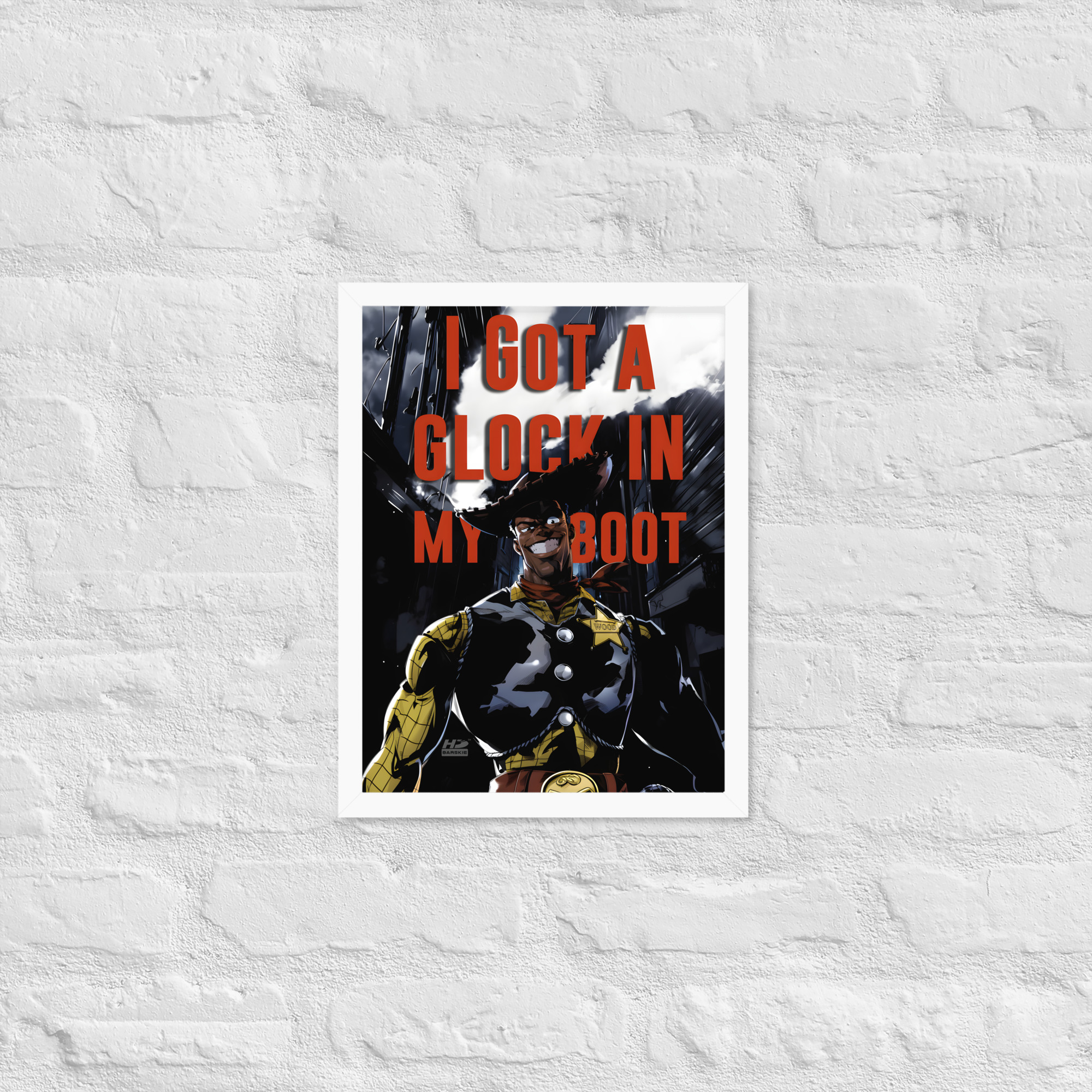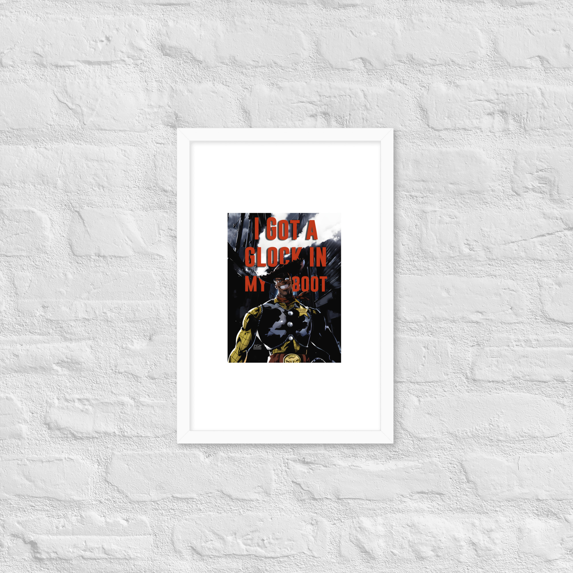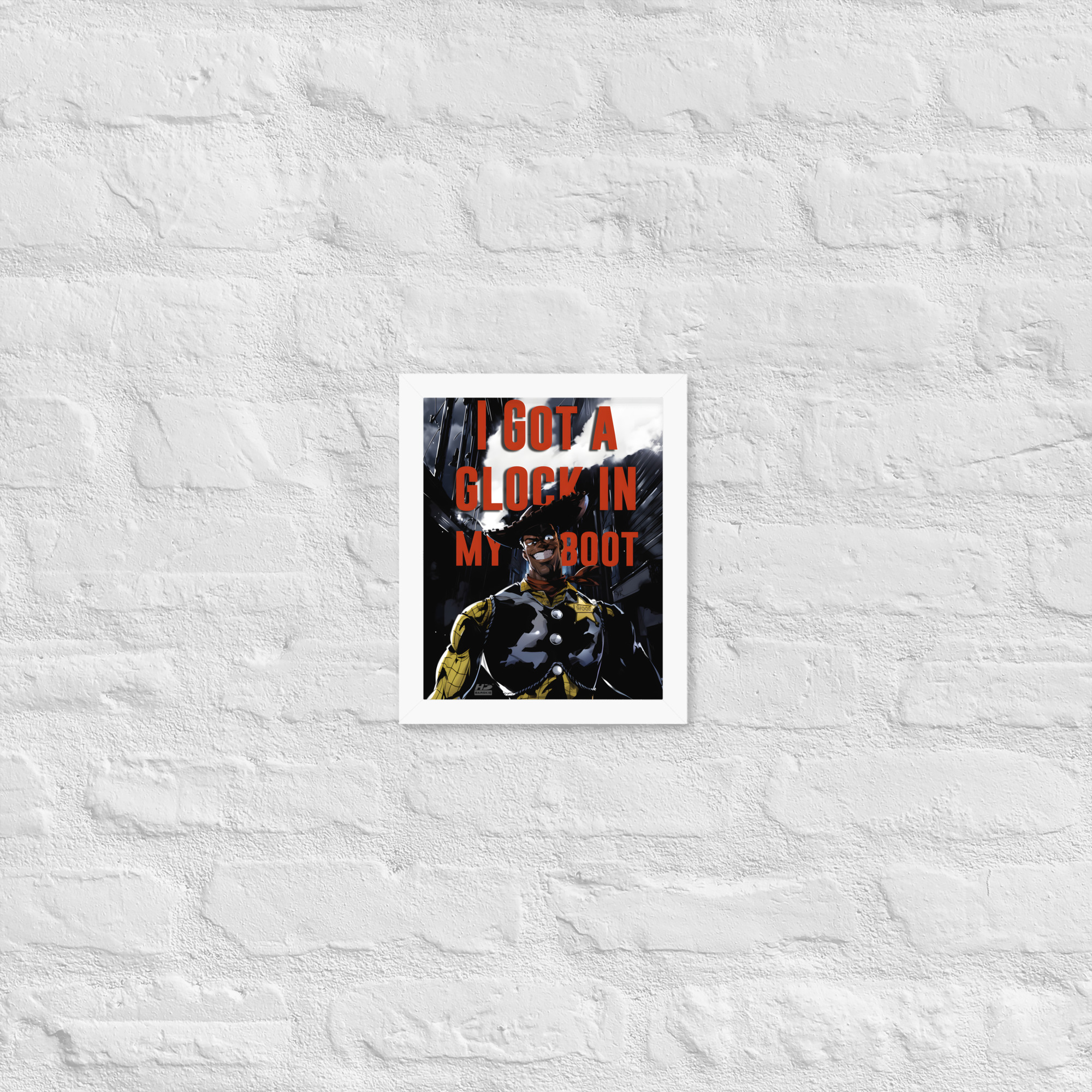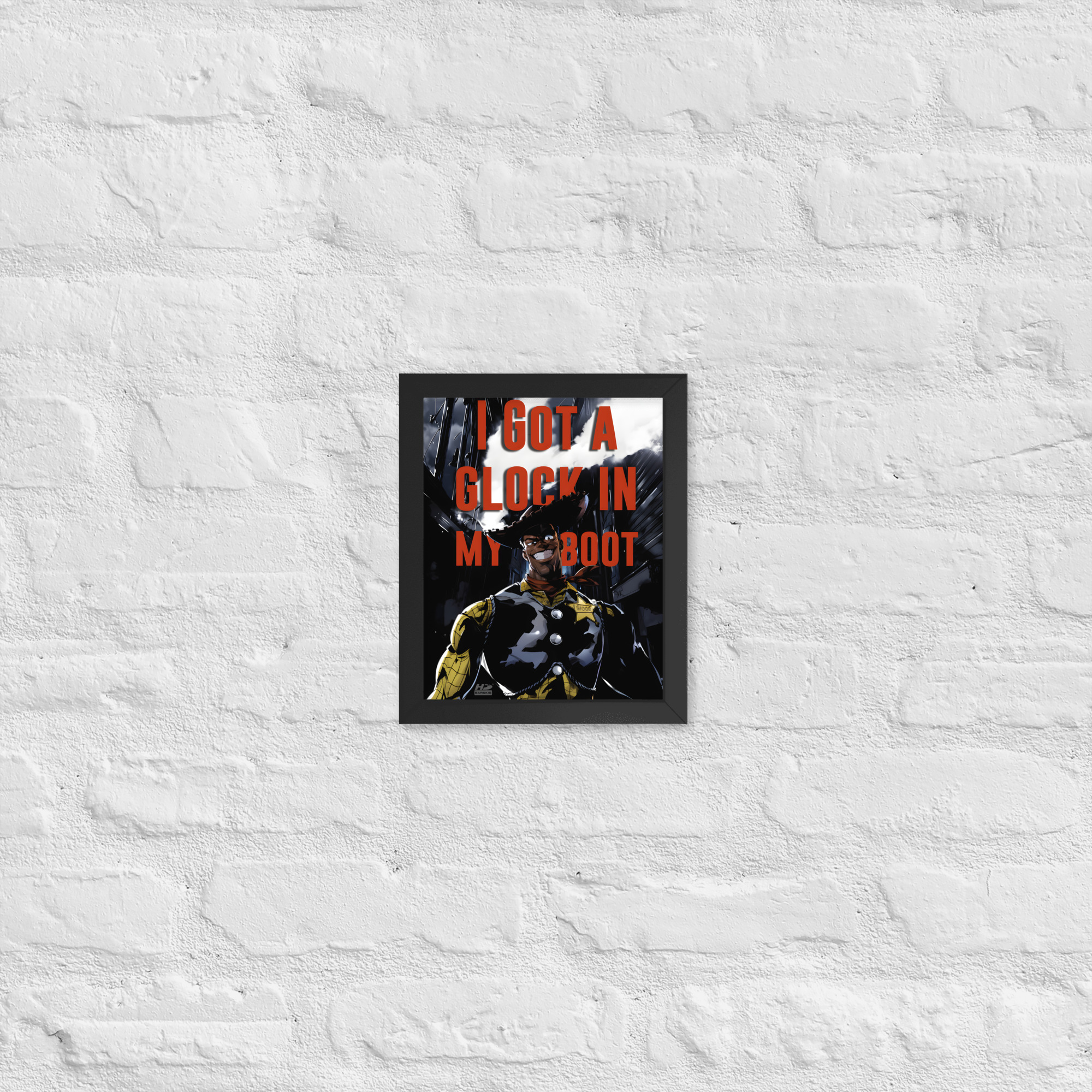 “There’s a Glock In My Boot” reimagines a familiar cowboy icon through a darker, modern lens, turning humor, tension, and cultural commentary into striking wall art.