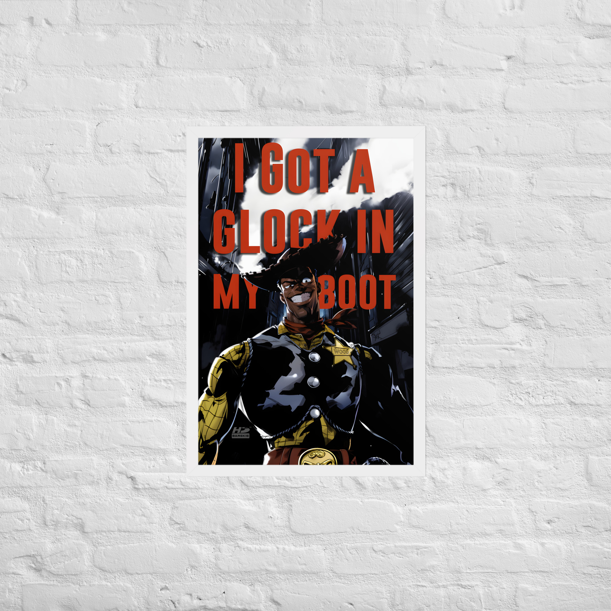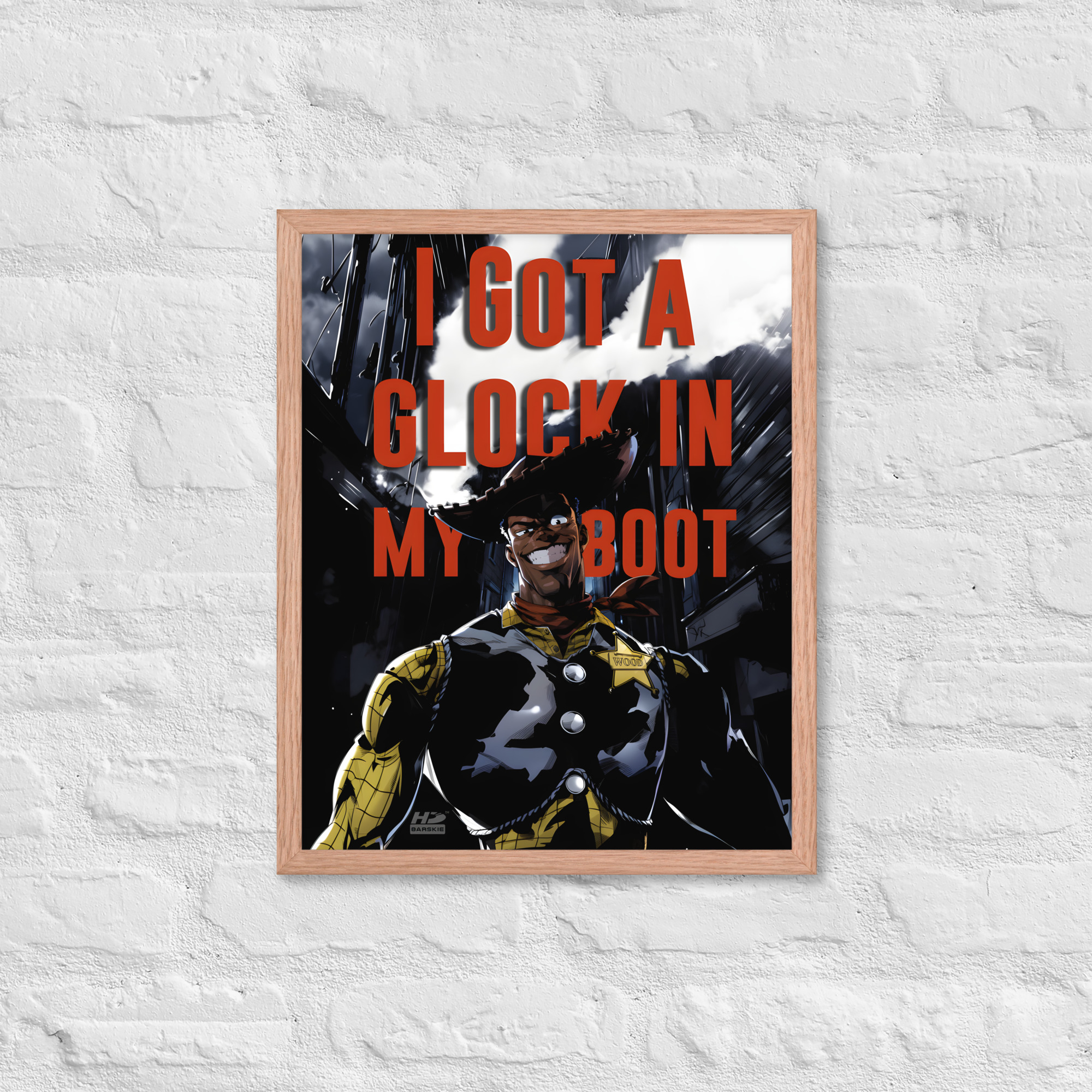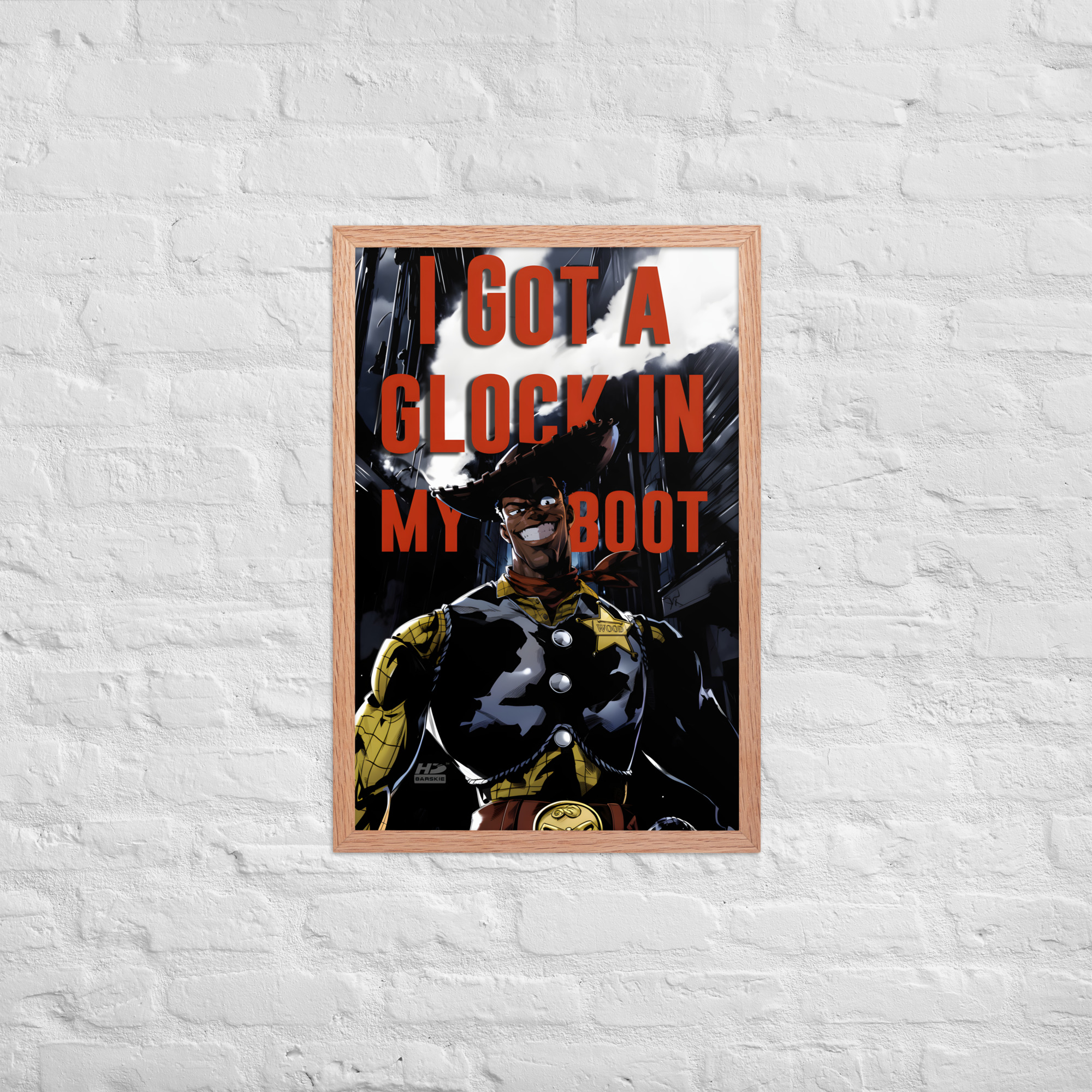 “There’s a Glock In My Boot” reimagines a familiar cowboy icon through a darker, modern lens, turning humor, tension, and cultural commentary into striking wall art.